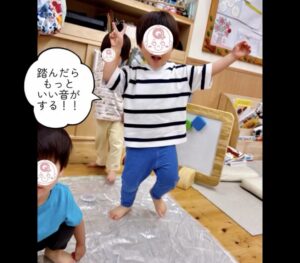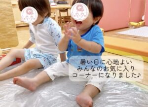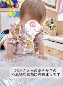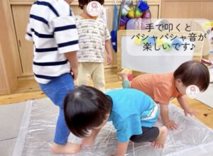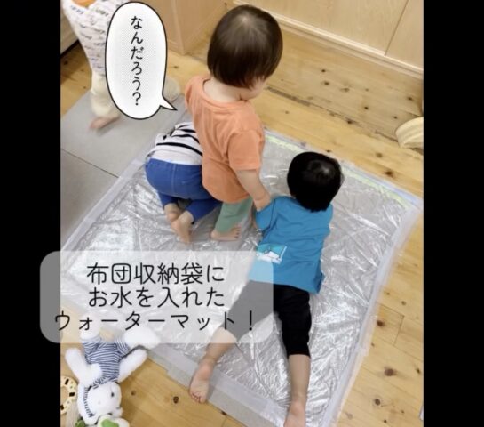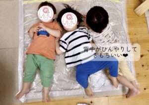 ウォーターマットで遊んでみました! 2025年6月20日更新 梅雨を飛び越え暑い日が続きますね☀️ お部屋でも涼しく過ごせるように、布団収納袋でウォーターマットを作ってみました! 口をテープで二重に留めて、さらに袋も二重にすると、子どもが元気に足踏みしても、大人が寝転がっても水漏れなく楽しめています✨ つめたさ、水の柔らかさ、水の動き、パシャパシャという音…などなど、五感をたくさん刺激してくれ、0歳児さんから2歳児さんまでみんなのお気に入りになりました♪