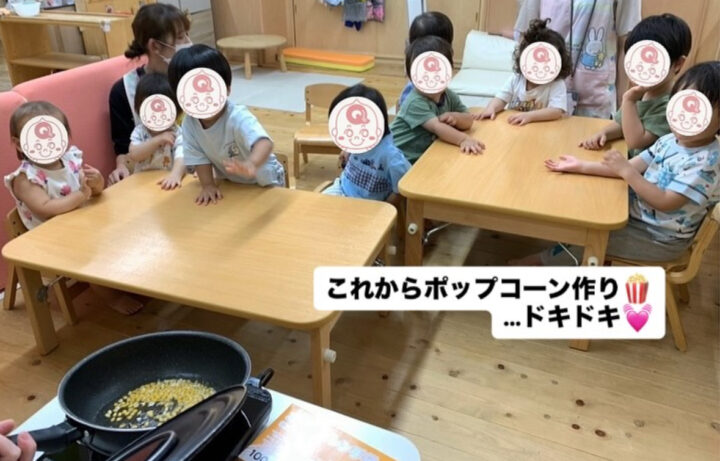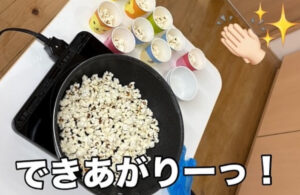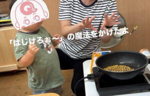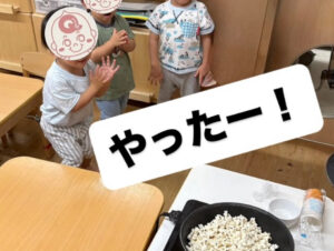 ポップコーン作り♪ 2025年10月9日更新 夏の思い出② ポップコーン作り🍿 (このお豆?がポップコーン?)と❓が浮かんでいた子どもたち…しばらく見守っていましたが、フライパンから良い香りがしてくるとソワソワ! そこに「パンッパン」と弾ける音が加わると、気持ちのボルテージも上がり大興奮でした😊 フライパンの蓋を開けた瞬間は、みんなの笑顔も弾けて、ニッコニコで試食しましたよ♪
