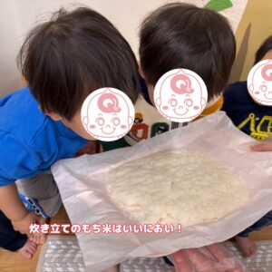 保育者のお手本を見て、みんなでぺったんぺったん。力を込めたりリズミカルについてみたり、杵にくっつくもちもちの感触に負けないようにがんばりました!