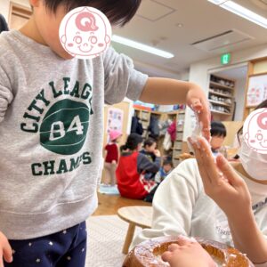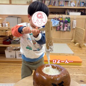 粘土とは違う感触に最初は控えめでしたが、最年少のお友だちが誰よりも大胆に触ってニコニコ!その楽しそうな様子に引き寄せられ、ぼくも、わたしも…とみんなで臼に手を入れていき、最終的にもちもちの両手になる子が続出でした!笑🤲🤍