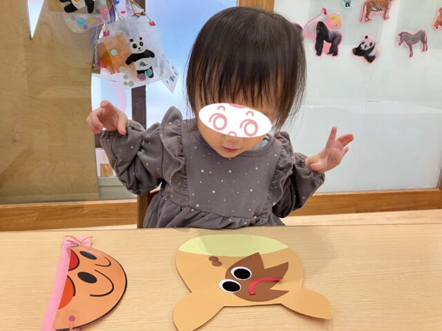 アイマスクも用意し、”目を隠して置いてみると面白い顔になるかも….?”と話すと目がキラキラの子どもたち🤩