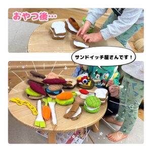 おやつの後、あるお友だちがパンのおもちゃを使ってサンドイッチ屋さんを開いてくれました。
