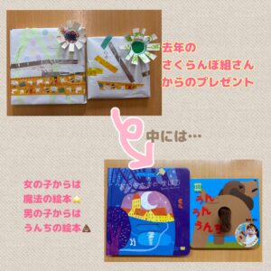 去年のさくらんぼ組さんにもらったプレゼントを読みながら「みんな、だいじょうぶかな?」「あたらしいほいくえん、たのしいかな?」などと思い出しては心配しています😳