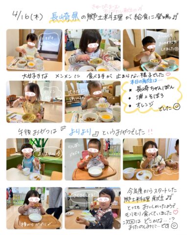 長崎県の郷土料理献立でした! 2026年4月21日更新 こんにちは🌈 きゅーぴーるーむP-kaboo園です🌱 今年度から始まった郷土料理献立! 第1回目は、長崎県! ⭐️長崎ちゃんぽん ⭐️浦上そぼろ ⭐️オレンジ が出ましたよ✨ 子どもたちもモリモリと食べ、ほとんどの子が完食👀✨ おかわりもよくしていました🎵 おやつは、🌈よりより🌈でした。 ネジネジな形に興味津々で、これもまた気に入ったようで、『また食べたーい!』の声が上がりました😊💞 5月は東京都の郷土料理です! どんな献立か、ワクワクですねっ🤭